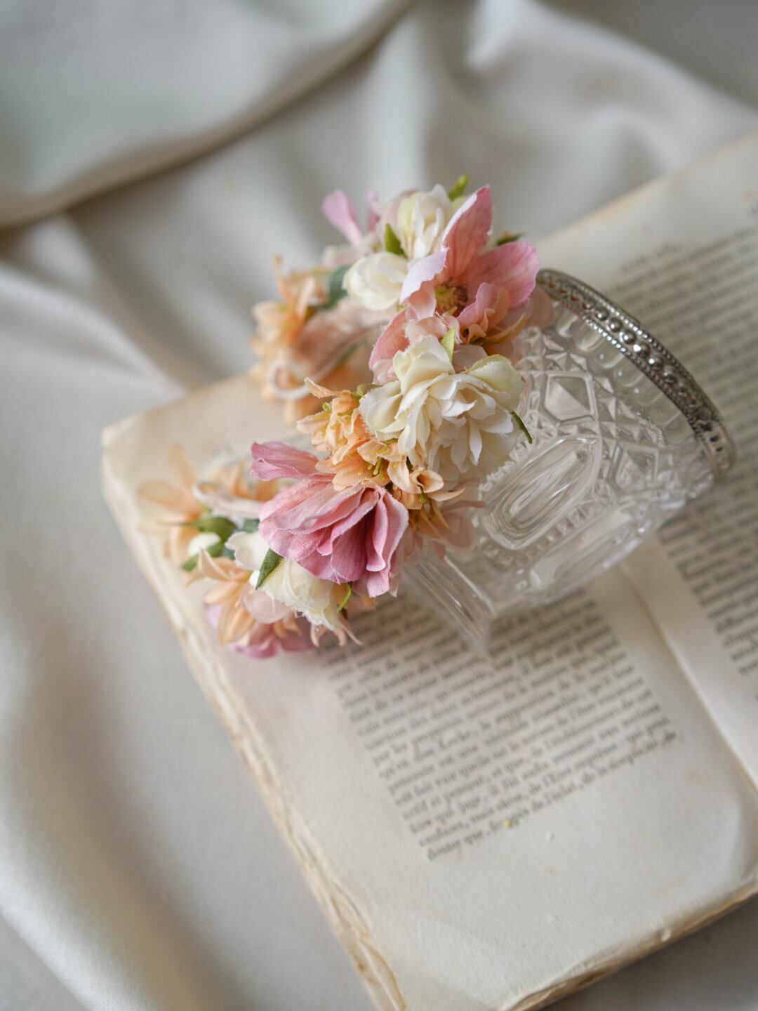 アーティフィシャルフラワー(高品質な造花)を贅沢に使用し、ふんわりと広がるお花たちが、特別な日のおめかしや記念撮影をより華やかに彩ります。