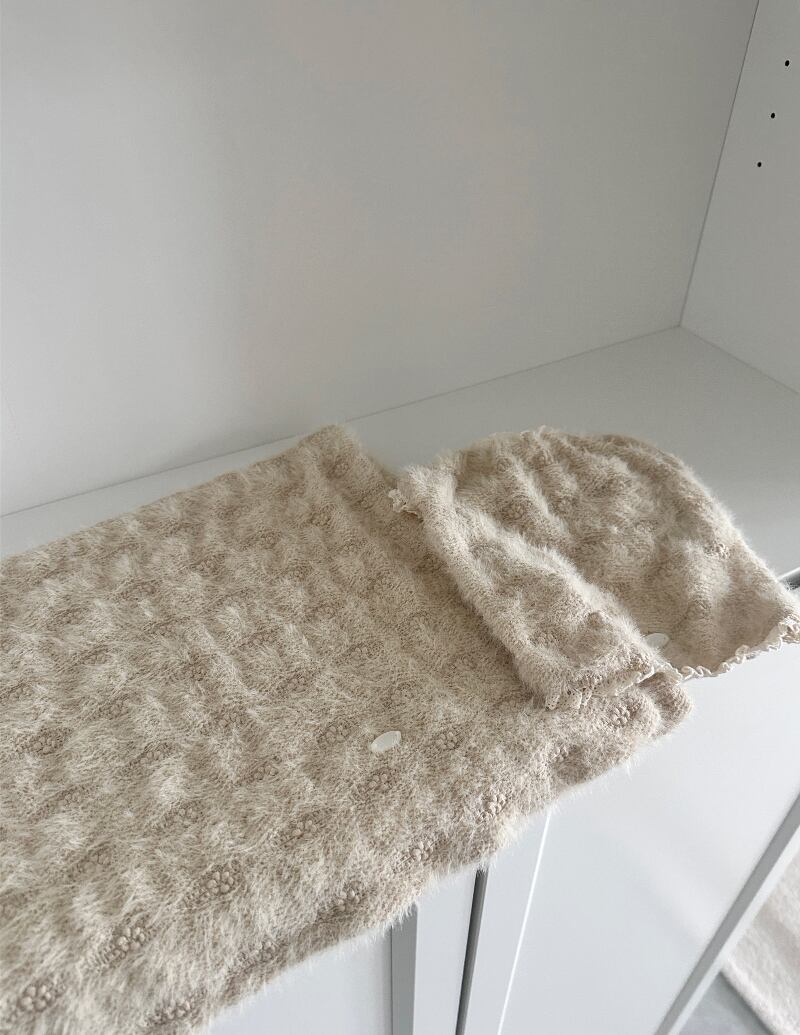 優しいヘアリーテクスチャーと花刺繍のような繊細な編み模様が、上品であたたかな印象を与えます。