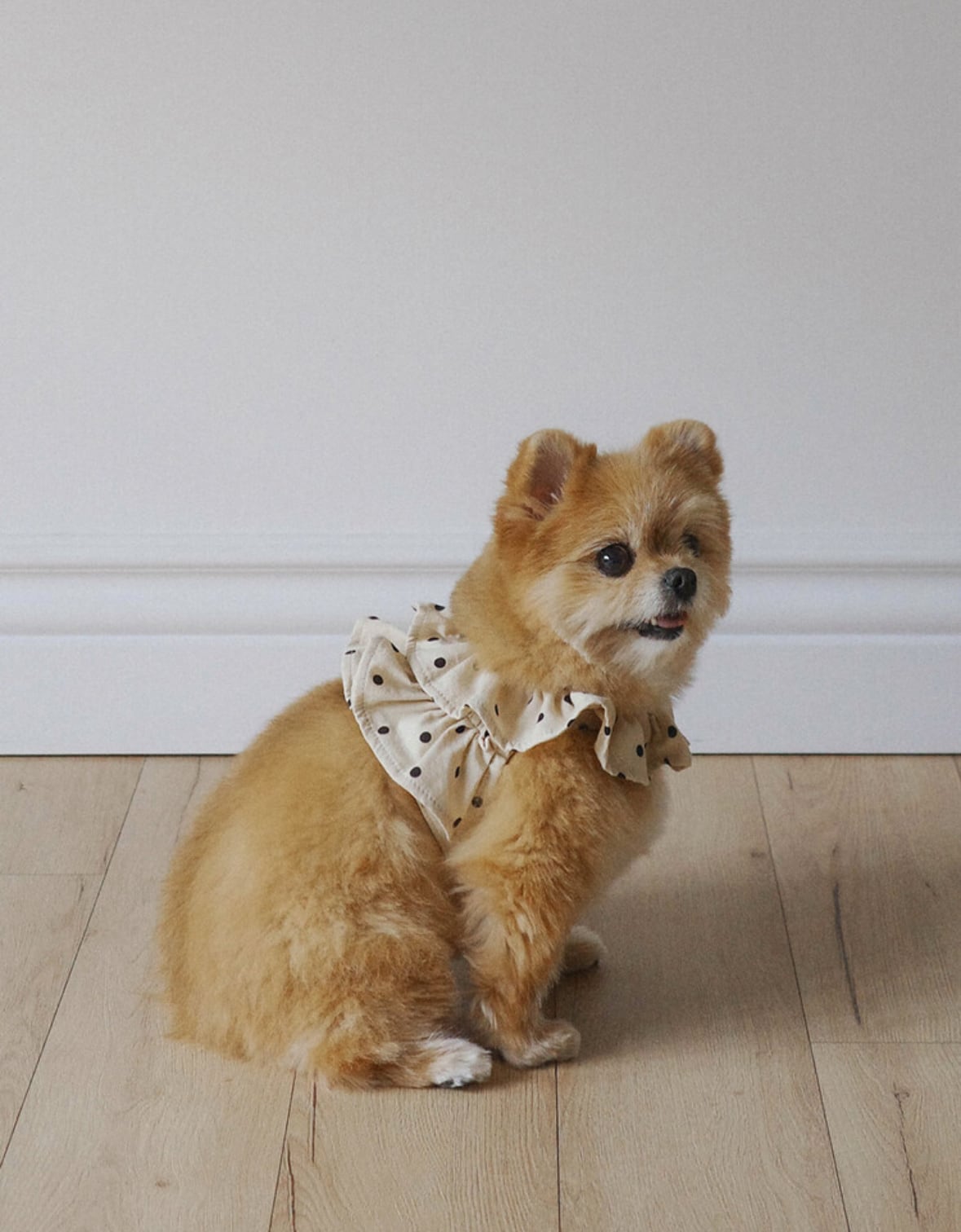 やわらかなクリームトーンに、小さなドット柄が愛らしいケープ型ハーネス。
