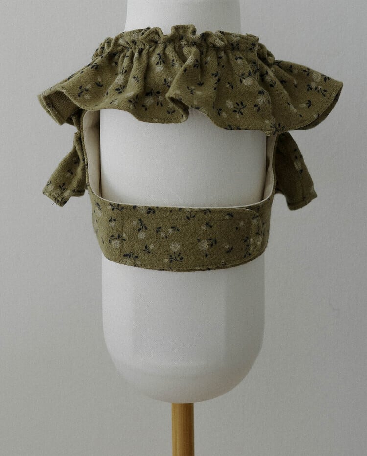 カーキに花柄が可愛らしく、首元をふわりと彩るケープスタイルのハーネス。