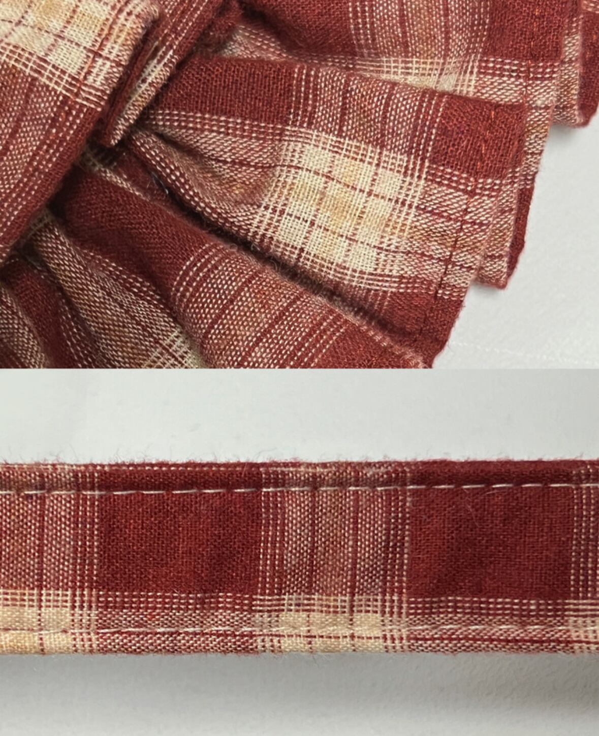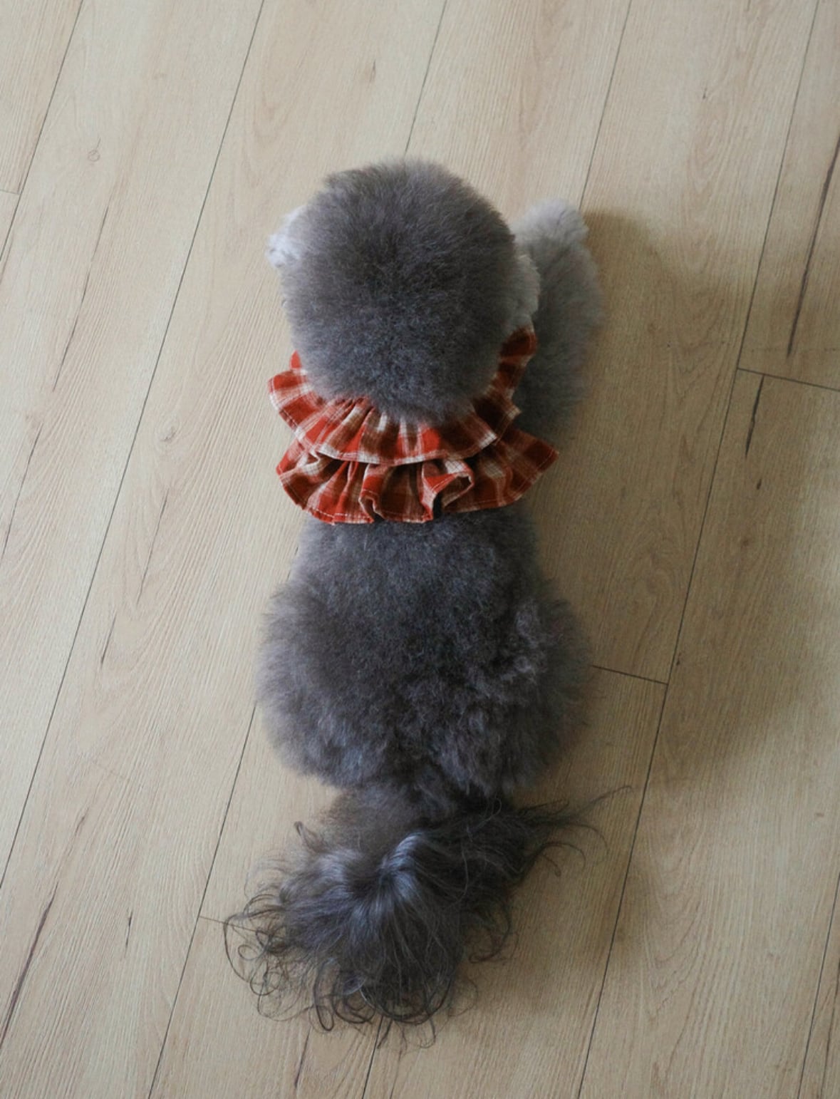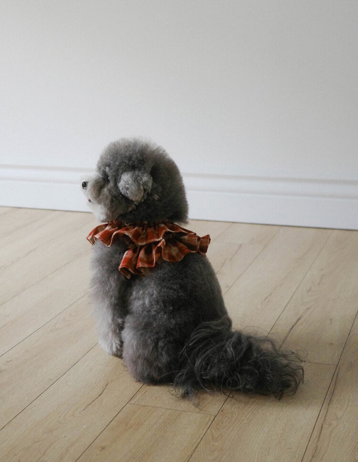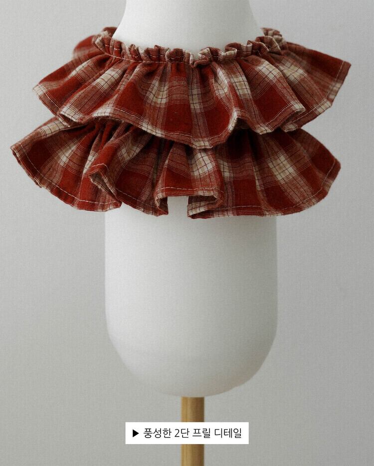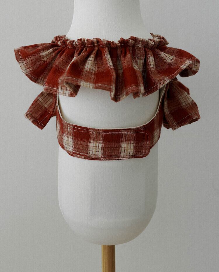 赤とベージュのチェック柄が首元をふわりと彩るケープスタイルのハーネス。