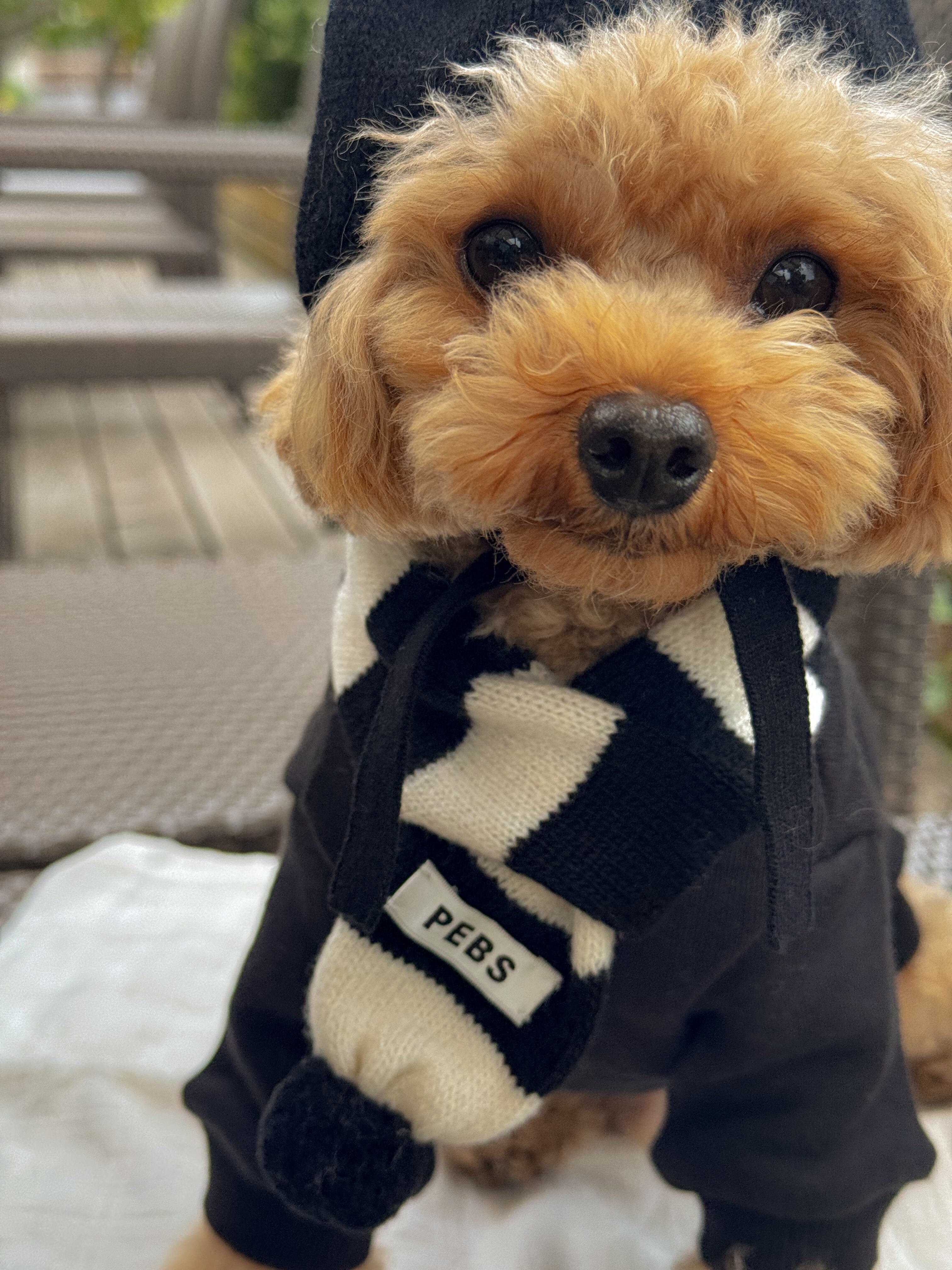 端についたポンポンと「PEBS」ロゴタグがアクセントになり、