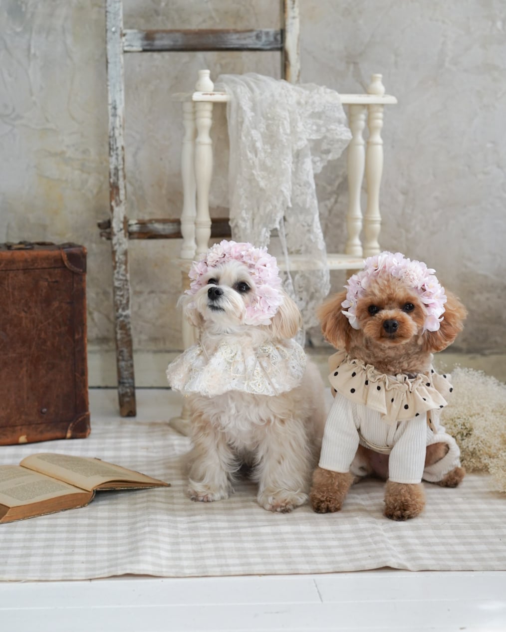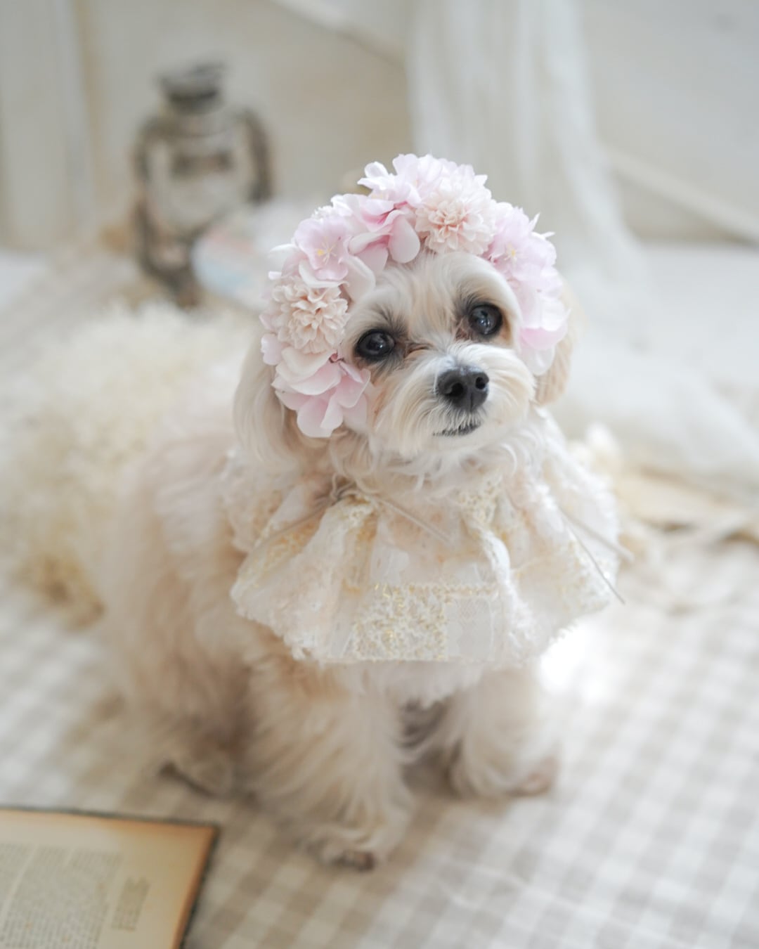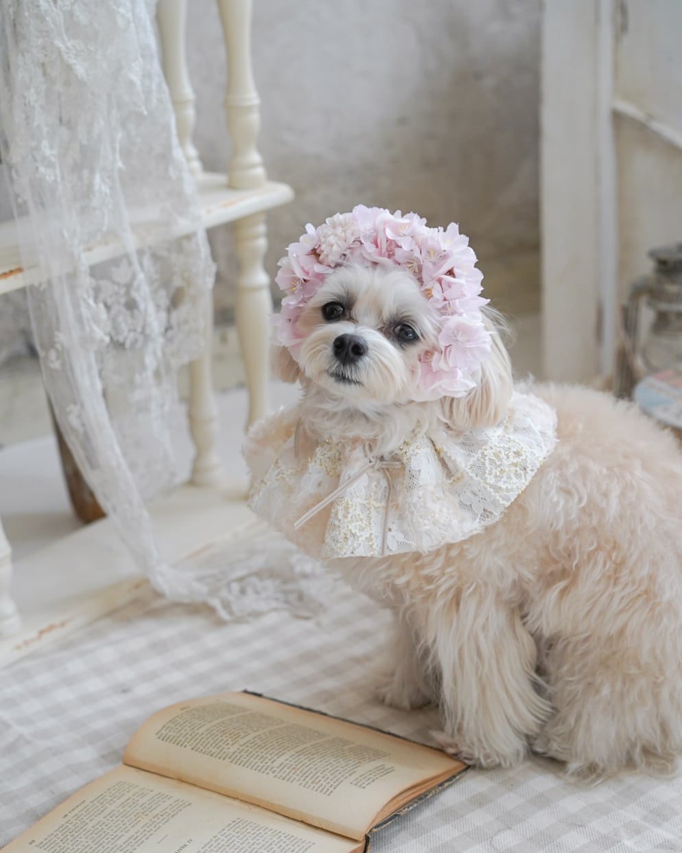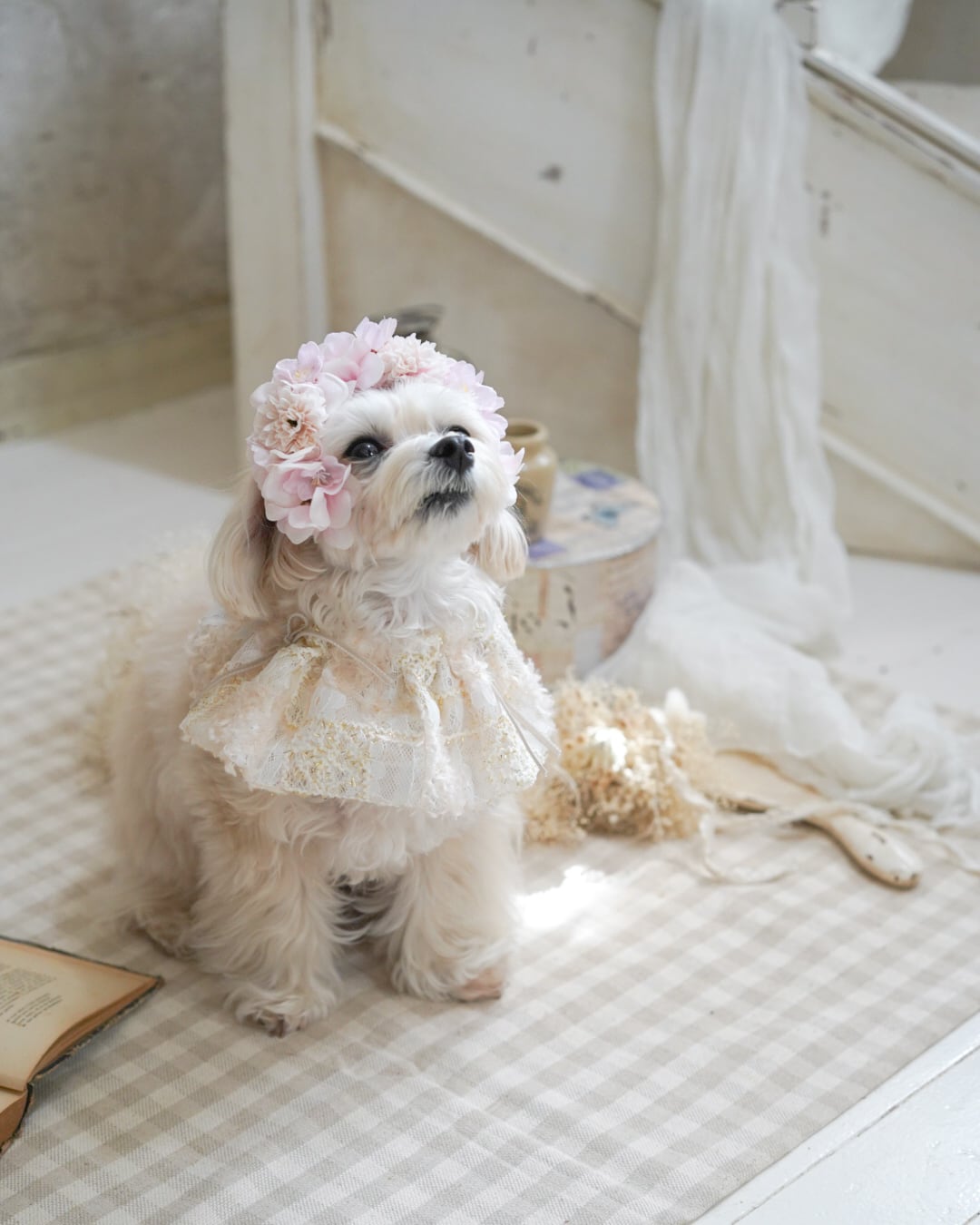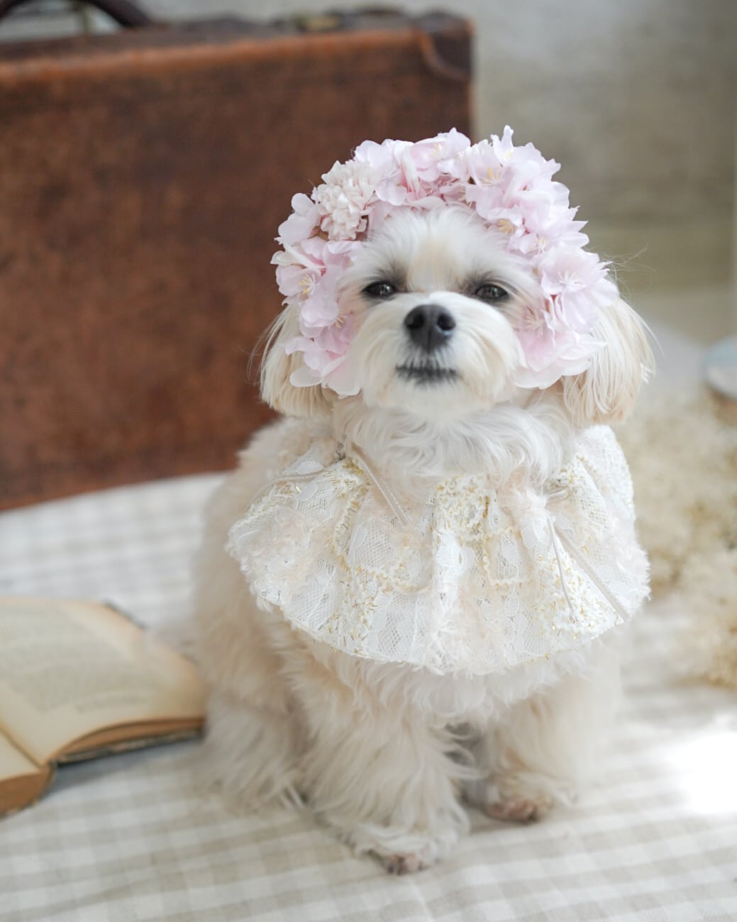 立体感のある花びらがわんちゃんの表情をやわらかく引き立てます。