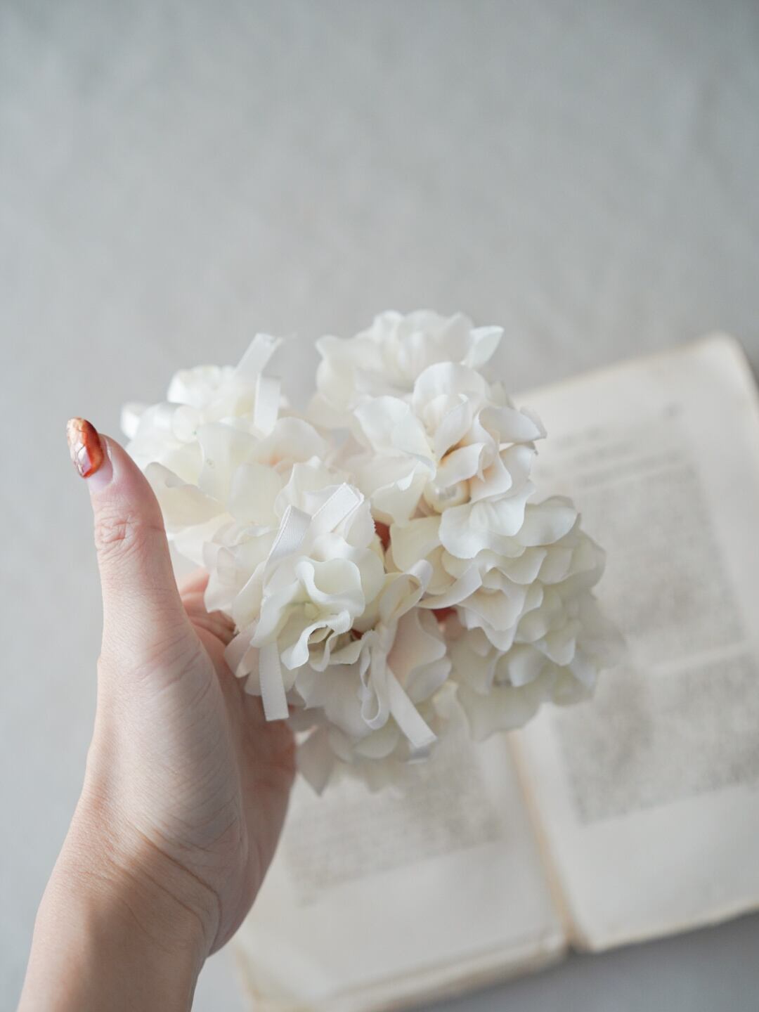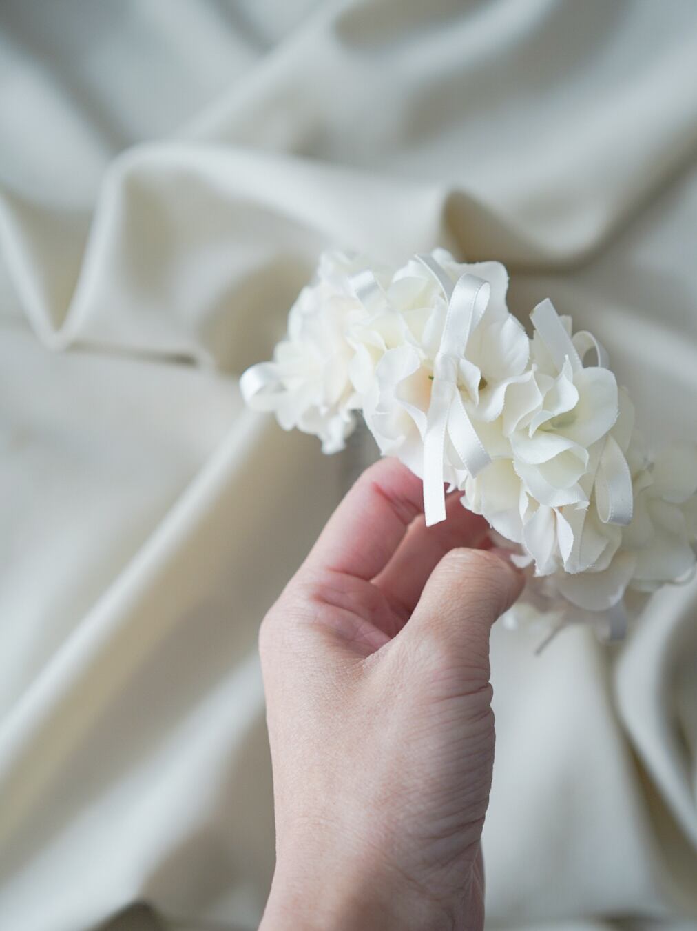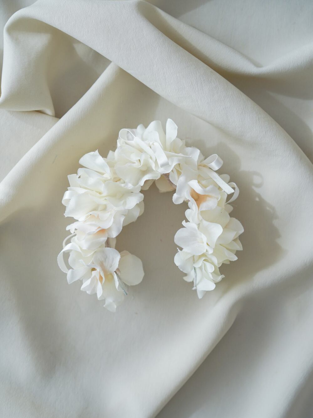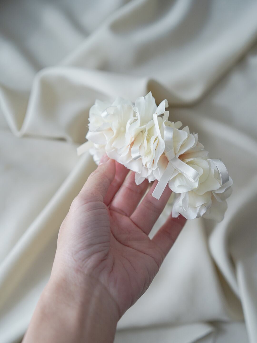 やわらかなホワイトのお花を重ねた