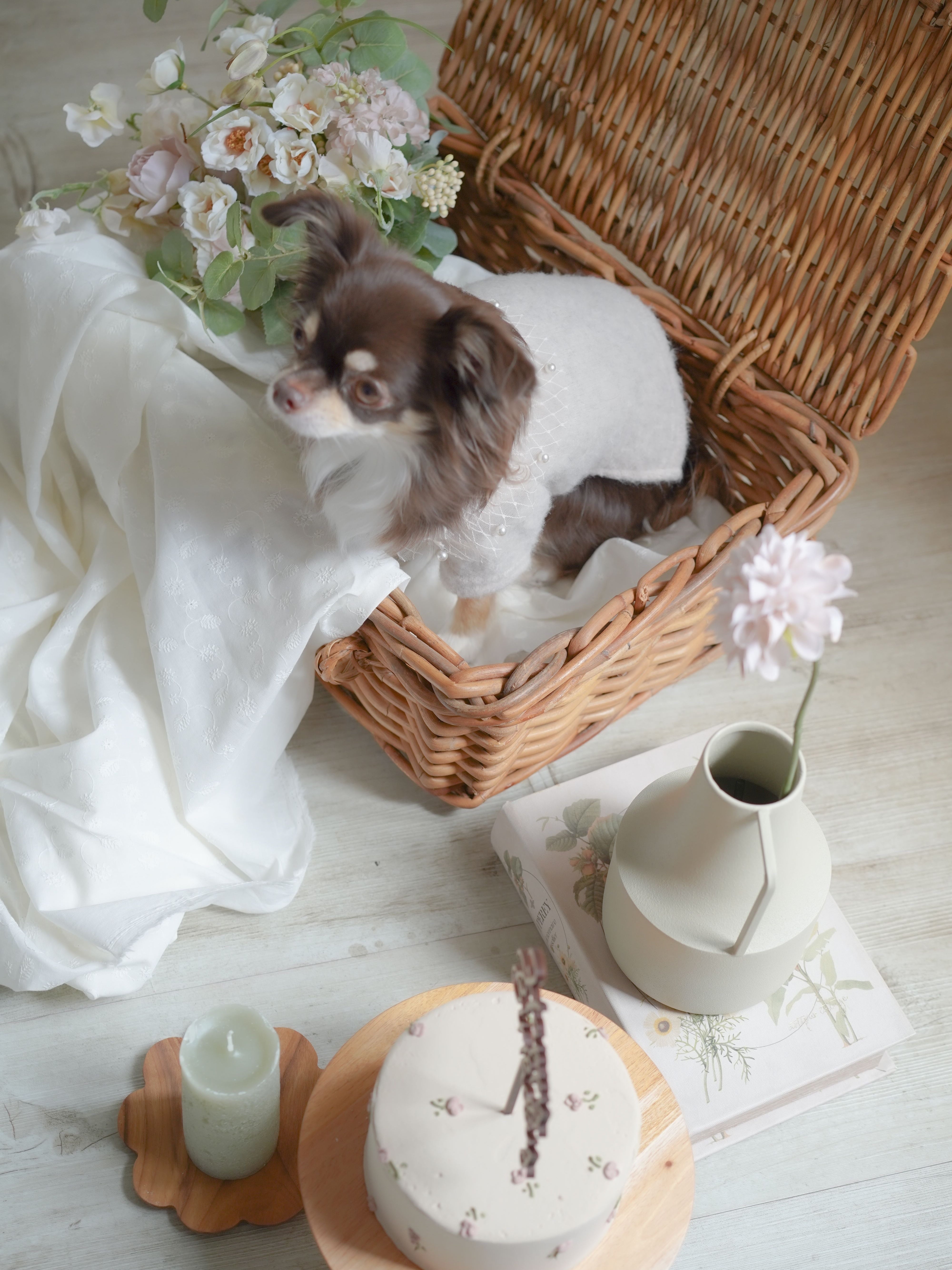 大きなラタンバスケットに白いクロスや優しい色合いの花を合わせた、温もりのある撮影セット。